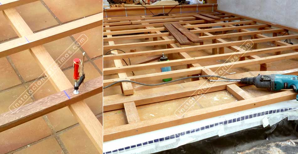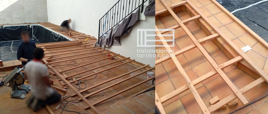 Colocación de tarima de exterior sobre rastreles tropicales cruzados.