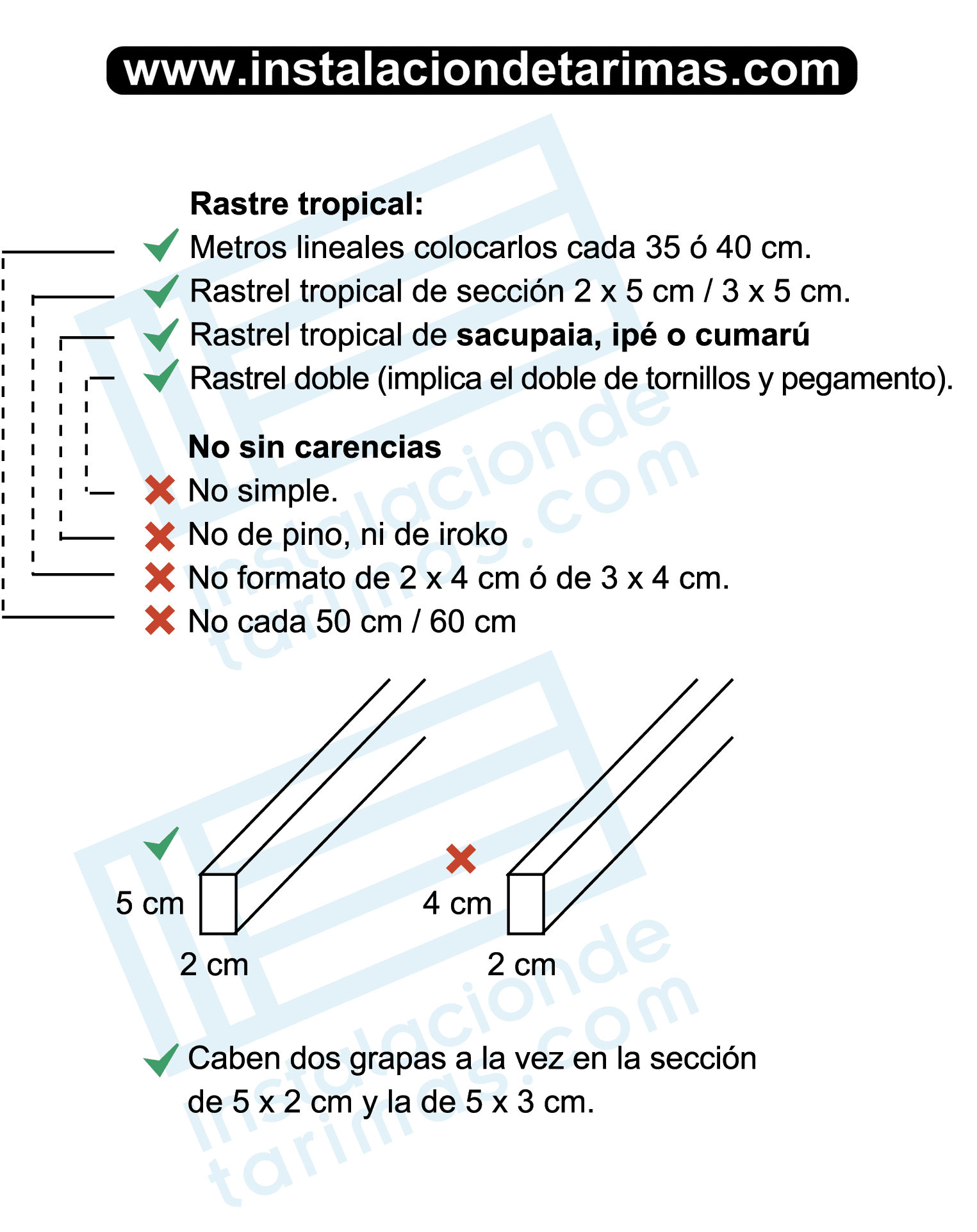 - 1- Que los rastreles sean de una madera blanda. De pino o abeto tintado de verde (cuperizado, termotratado o autoclave).