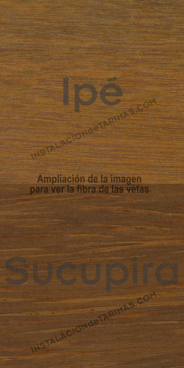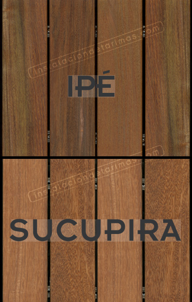 • SUCUPIRA: Es una madera muy similar al ipé, se distingue sólo desde muy cerca observando las vetas. En general el color es muy similar. El la sucupira domina un color caramelo y en el ipé hay varios colores (verdosos, caramelo, naranjas, rojizos, etc)
