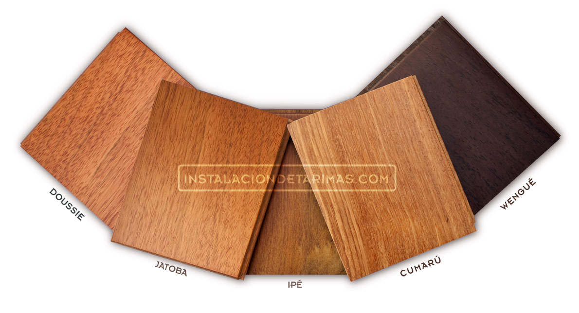 Abanico de maderas tropicales, sucesivamente: doussie; jatoba; ipé; cumarú amarillo y wengué