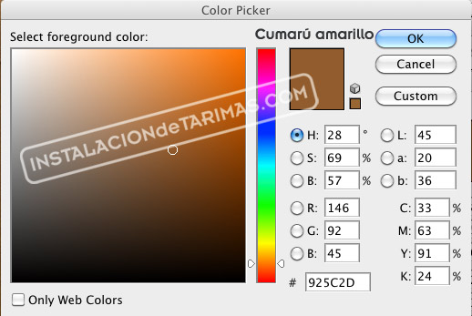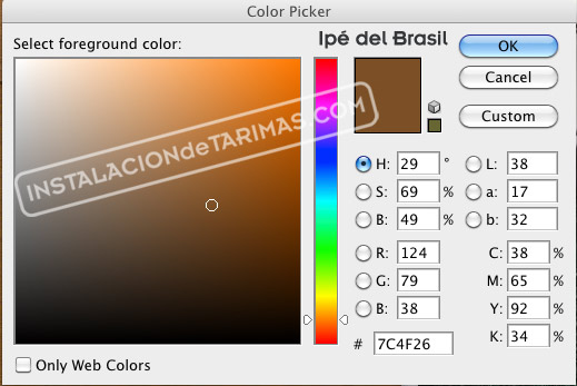 Podemos ver que en la madera de ipé el nivel de cyan es más elevado ( C= 38 puntos), mientras que en el cumarú amarillo el cyan es un poco más bajo ( C= 33 puntos).